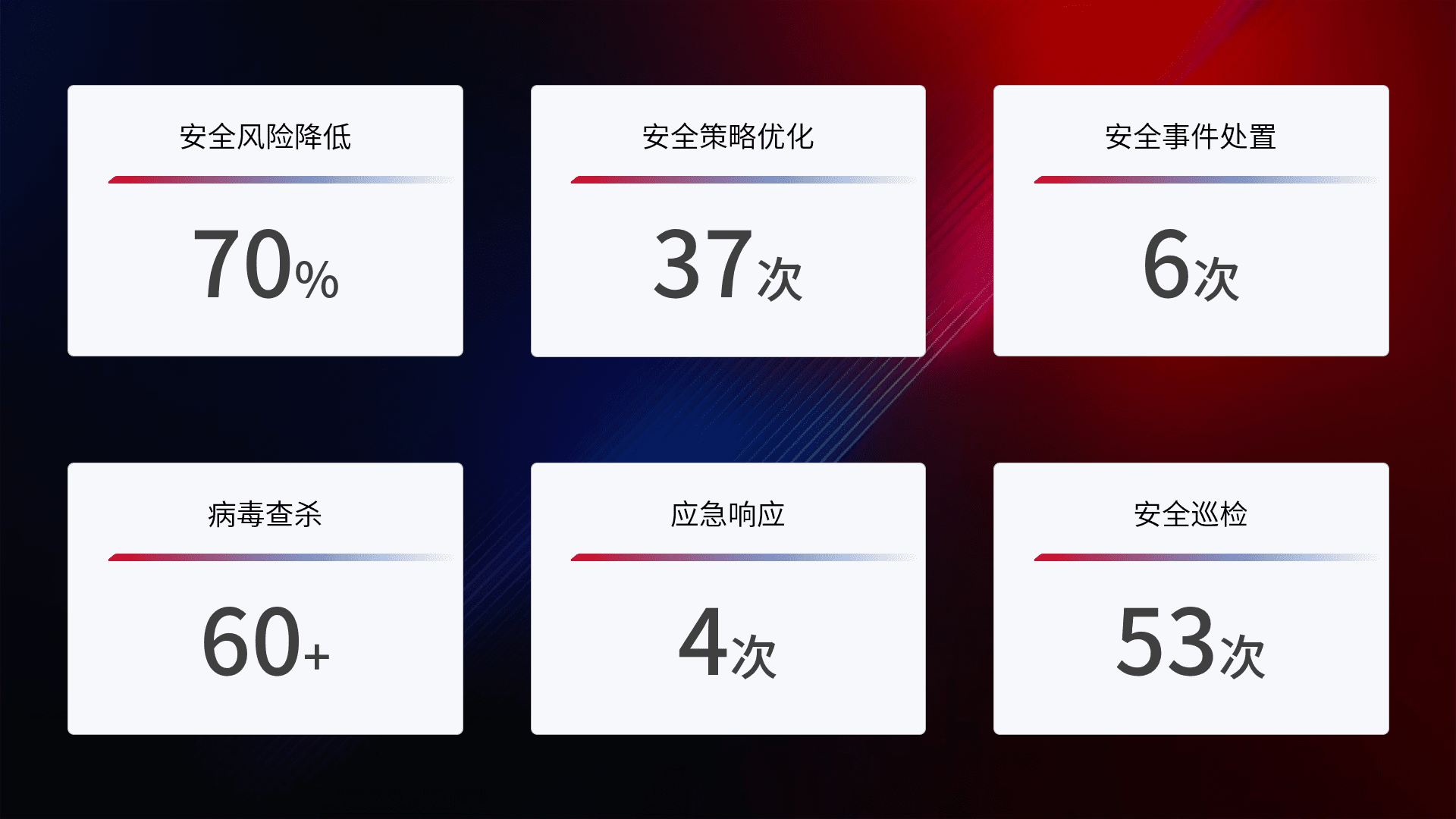 提供全面的安全事件报告体系,,包括处置报告、、周报、、、季度和年度总结,,结合持续监控,,,帮助客户深入了解网络安全状况。。